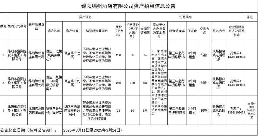綿陽(yáng)綿州酒店有限公司資產(chǎn)招租信息公告