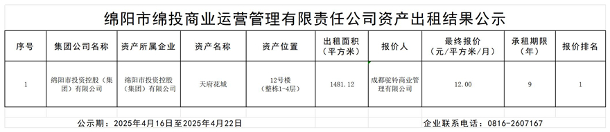 綿陽市綿投商業(yè)運(yùn)營管理有限責(zé)任公司資產(chǎn)出租結(jié)果公示