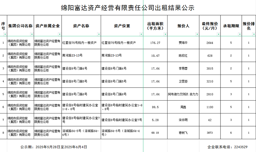 綿陽(yáng)富達(dá)資產(chǎn)經(jīng)營(yíng)有限責(zé)任公司出租結(jié)果公示