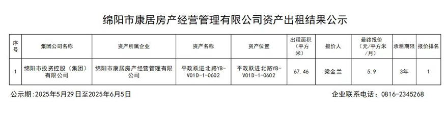 綿陽(yáng)市康居房產(chǎn)經(jīng)營(yíng)管理有限公司資產(chǎn)出租結(jié)果公示