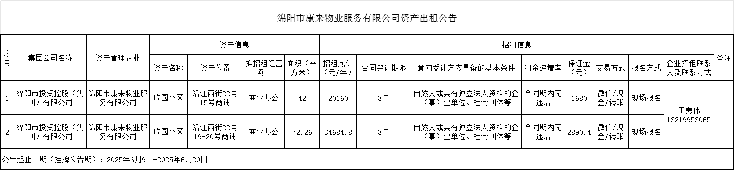 綿陽市康來物業(yè)服務有限公司資產出租公告