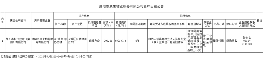 綿陽(yáng)市康來(lái)物業(yè)服務(wù)有限公司資產(chǎn)出租公告
