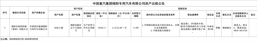 中國(guó)重汽集團(tuán)綿陽(yáng)專(zhuān)用汽車(chē)有限公司資產(chǎn)出租公告