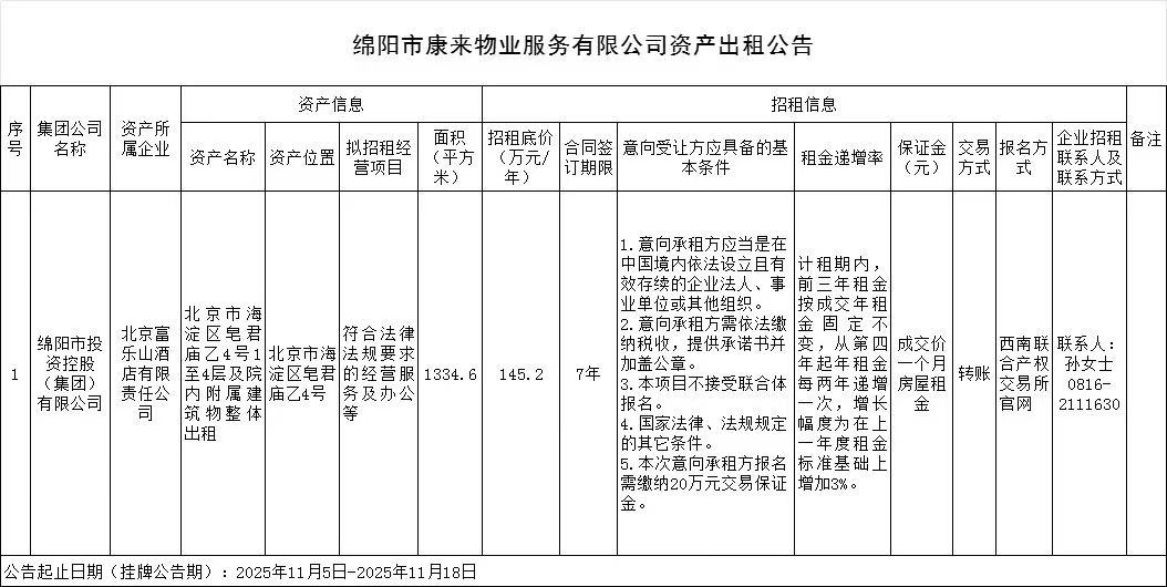 綿陽(yáng)市康來(lái)物業(yè)服務(wù)有限公司資產(chǎn)出租公告