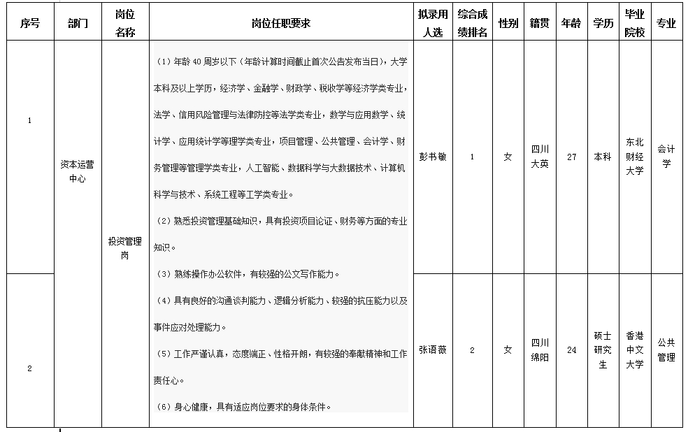 根據(jù)綿陽市投資控股(集團)有限公司發(fā)布的招聘公告及招聘相關(guān)規(guī)定,經(jīng)筆試、面試、考察、體檢等程序,擬錄用彭書敏等同志到綿陽市投資控股(集團)有限公司工作,現(xiàn)予以公示,具體情況如下: