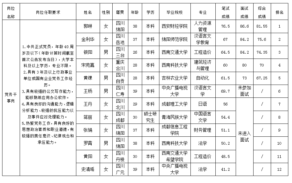 根據(jù)綿陽市投資控股(集團(tuán))有限公司發(fā)布的招聘公告及招聘相關(guān)規(guī)定,經(jīng)筆試、面試等程序,現(xiàn)將筆試(面試)成績予以公示。