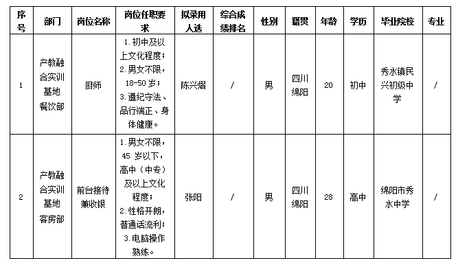 根據(jù)綿陽市綿州嘉來會務(wù)服務(wù)有限公司發(fā)布的招聘公告及招聘相關(guān)規(guī)定,經(jīng)面試、體檢等程序,擬錄用陳興熠、張陽同志到產(chǎn)教融合實訓(xùn)基地餐飲部、客房部工作,現(xiàn)予以公示,具體情況如下: