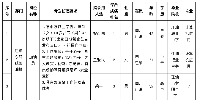 【公開招聘】四川綿江能源有限公司 關(guān)于招聘加油員崗位擬錄用人員的公示