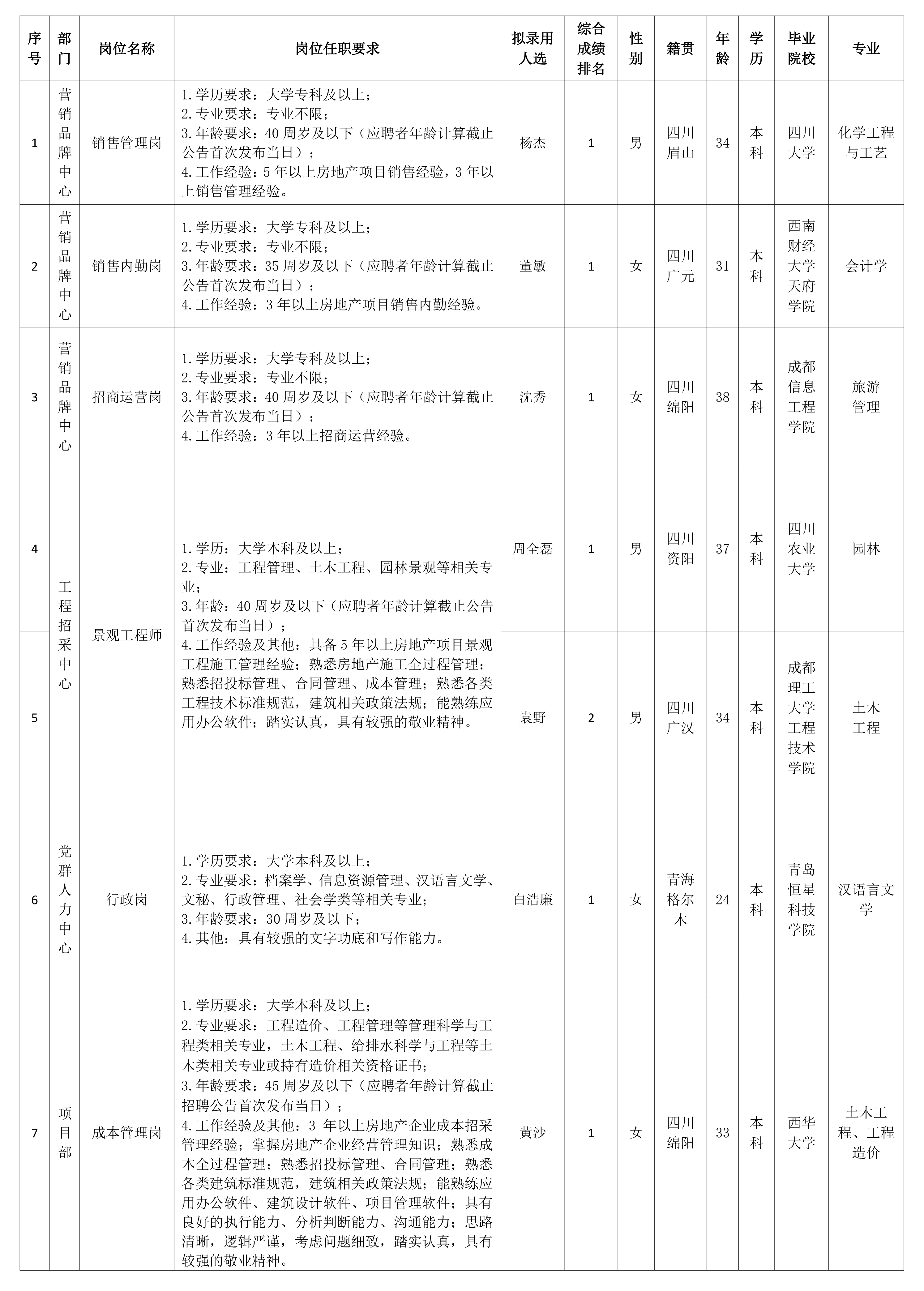根據(jù)綿陽(yáng)市綿投置地有限公司發(fā)布的招聘公告及招聘相關(guān)規(guī)定,經(jīng)筆試、面試、考察、體檢等程序,擬錄用楊杰等同志到綿陽(yáng)市綿投置地有限公司工作,現(xiàn)予以公示,具體情況如下: