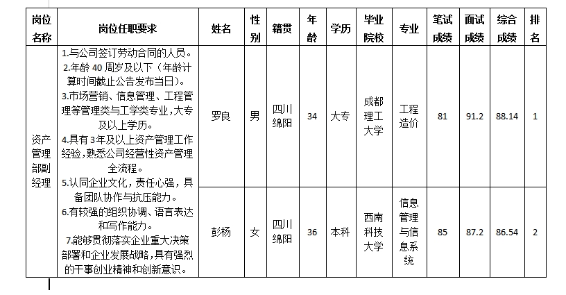 根據(jù)綿陽市綿投商業(yè)運(yùn)營管理有限責(zé)任公司發(fā)布的競聘公告及競聘相關(guān)規(guī)定,經(jīng)筆試、面試等程序,現(xiàn)將筆試(面試)成績予以公示。