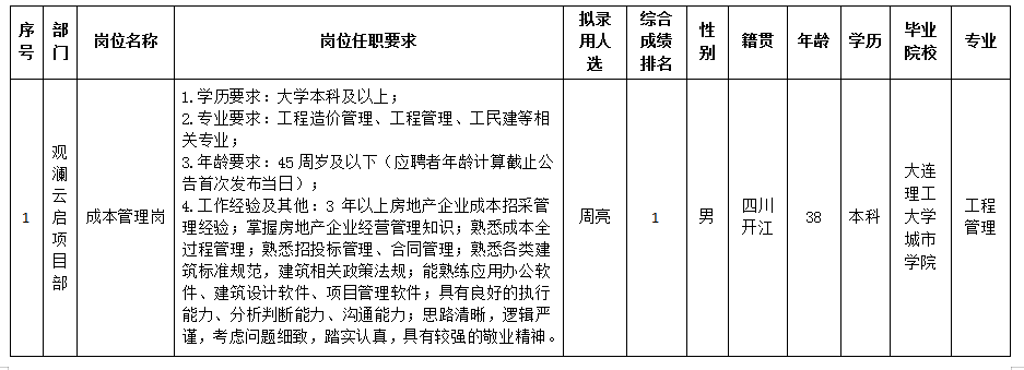 根據(jù)綿陽(yáng)市綿投置地有限公司發(fā)布的招聘公告及招聘相關(guān)規(guī)定,經(jīng)筆試、面試、考察、體檢等程序,擬錄用周亮同志到綿陽(yáng)市綿投置地有限公司工作,現(xiàn)予以公示,具體情況如下: