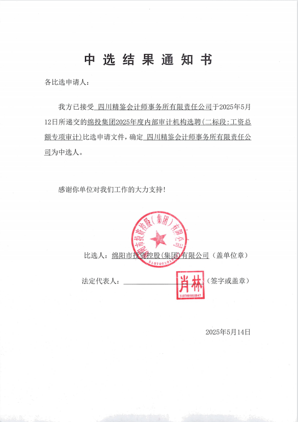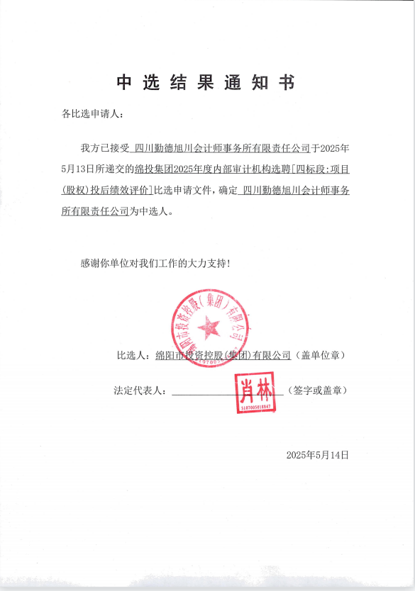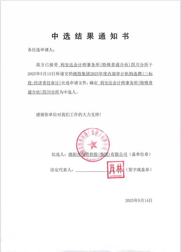 綿投集團(tuán)2025年度內(nèi)部審計(jì)機(jī)構(gòu)選聘中選結(jié)果通知書
