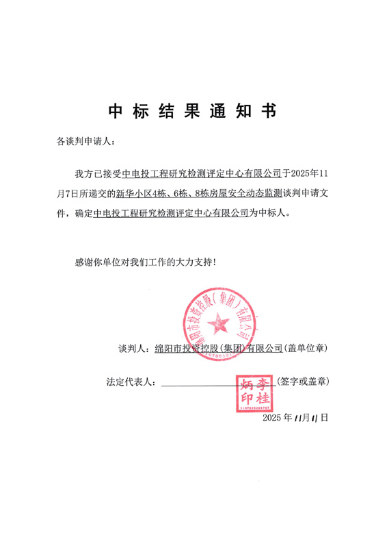 新華小區(qū)4棟、6棟、8棟房屋安全動態(tài)監(jiān)測中標(biāo)結(jié)果通知