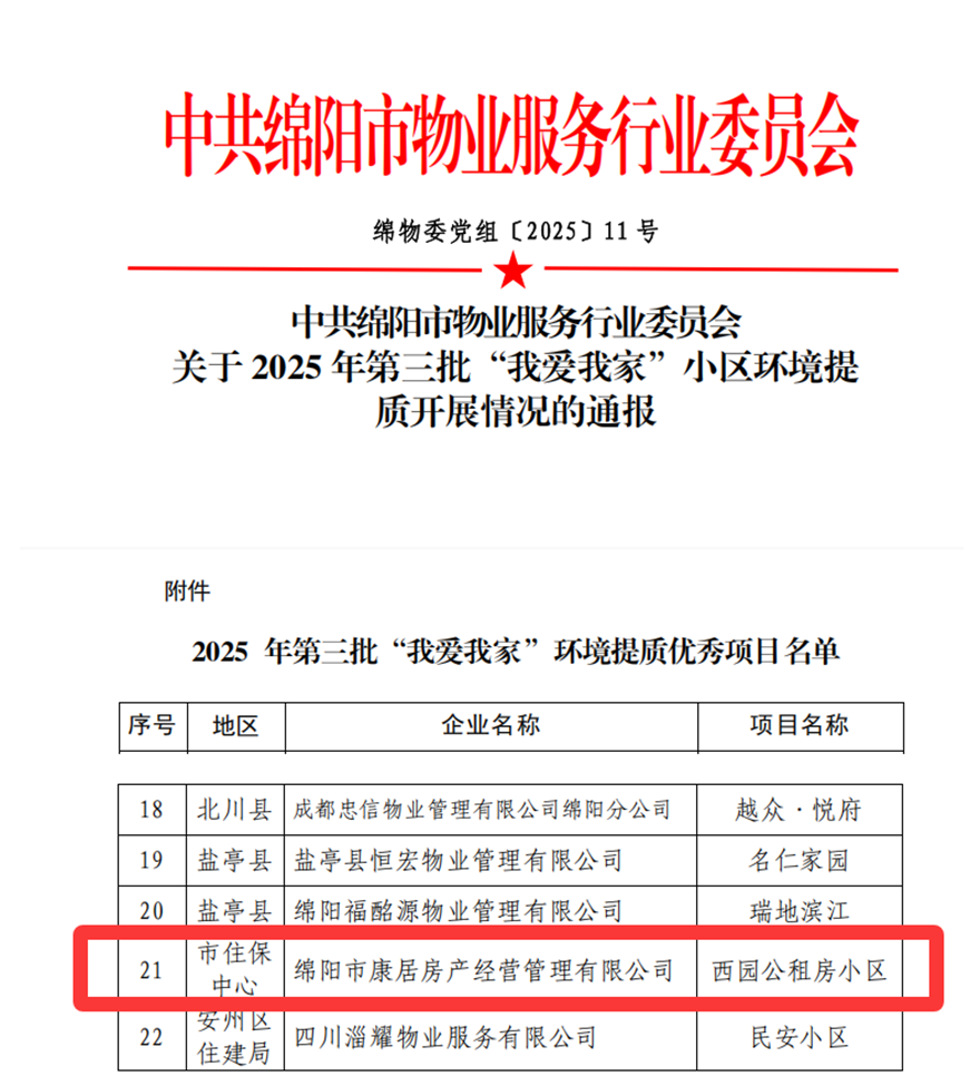 近日,綿陽市物業(yè)服務(wù)行業(yè)協(xié)會通報(bào)表揚(yáng)2025年第三批“我愛我家”小區(qū)環(huán)境提質(zhì)優(yōu)秀項(xiàng)目,西園公租房小區(qū)榜上有名。成績的取得,是對康居公司踐行“三心”服務(wù),即:以住戶為核心、與住戶貼心、讓住戶放心的有力佐證。